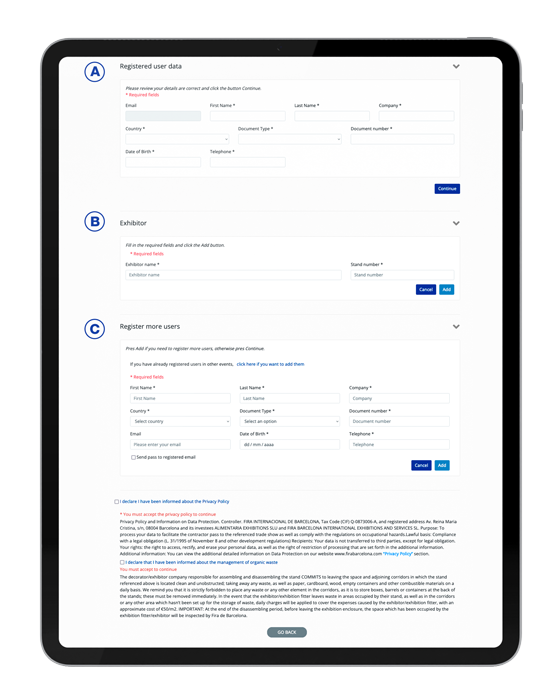 - Enter your details (#A) and exhibitor’s details (Name and stand) (#B).
